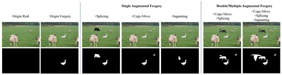 This method uses copy-move, splicing, and inpainting as three primary forgery operations. By setting the number of iterations to k, we randomly selected a forged image and its corresponding forgery mask from an existing dataset. Each iteration uses the previously forged image as the base for the next, continuing this process until the iteration step is reached. The so-called self-supervision means that the pixel-level mask of the generated fake samples can be automatically inferred from the input fake image and its mask, without the need for manual annotation. This self-supervised generation approach not only yields a variety of single, double, and multiple forgery samples, resulting in different forgery types, but also significantly increases the number of forged pixels in the forged images, helping mitigate the impact of the high imbalance between authentic and forged pixels on the task of forgery localization.