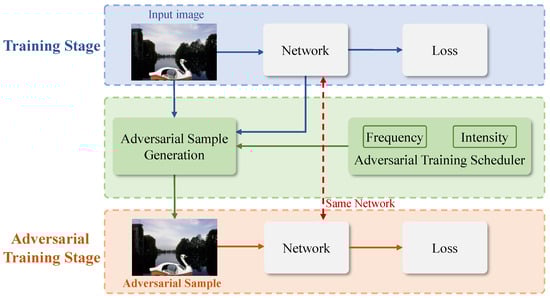 where k denotes the number of training stages, i denotes the current training stage number (starting from 0), t denotes the current epoch number, T denotes the total number of epochs during the entire training process, is a hyperparameter controlling the interval between two self-adversarial training, and means that for, every standard iterations in stage i, one self-adversarial training iteration is performed.