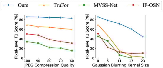We perform robustness analyses on two prevalent image post-processing operations: JPEG compression and Gaussian blurring. Our method demonstrates superior resistance to both JPEG compression and Gaussian blurring, consistently outperforming the other three methods, as illustrated in Figure 6. In the JPEG compression test, our method exhibits minimal performance degradation. In the Gaussian blurring test, while the performance of the other methods significantly degrades with larger kernel sizes, resulting in near-zero F1 scores, our method still maintains high performance. This confirms our method’s robustness.