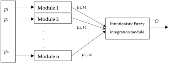 The output integration module output O incorporates an intuitionistic fuzzy evaluator (IFE). The rationale behind its use is to leverage the advantages of refined classification based on the three degrees: membership, non-membership, and hesitation. As a result, the output of the intuitionistic fuzzy integration module yields values influenced by all inputs, with each input contributing to the final result proportionally as a coefficient that reflects the accuracy of the respective module. Consequently, the influence coefficient of each module is directly proportional to its classification accuracy. When generating the final output of the module, the positive contribution of each individual module is extracted based on its respective degree of membership μ.