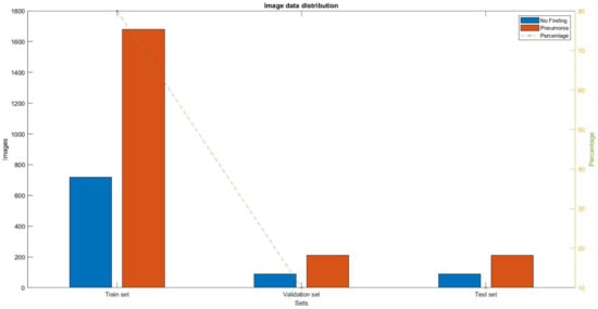 When the X-ray images are submitted, the distribution shown in Figure 3 is obtained. It shows the number of X-ray images labeled with the presence of pneumonia and the absence of pneumonia for the three groups (training, testing, and verification).