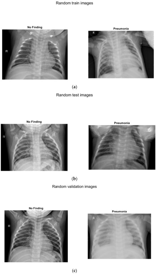 Three separate images show sample images with and without pneumonia of children up to 5 years old (Figure 4): (a) for training, (b) for testing, (c) for verification.
