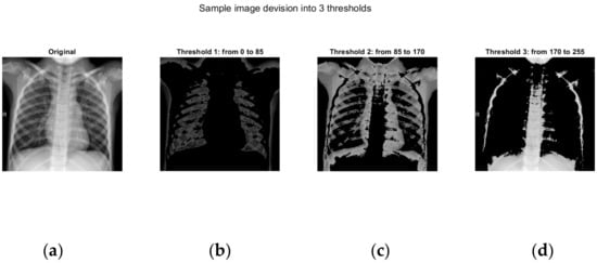 In Figure 5, the images of three different chest X-rays are presented, distributed according to the indicated thresholds. As shown, the first image represents the original chest X-ray. The next three images display visualizations of the image confined to the specified intervals.