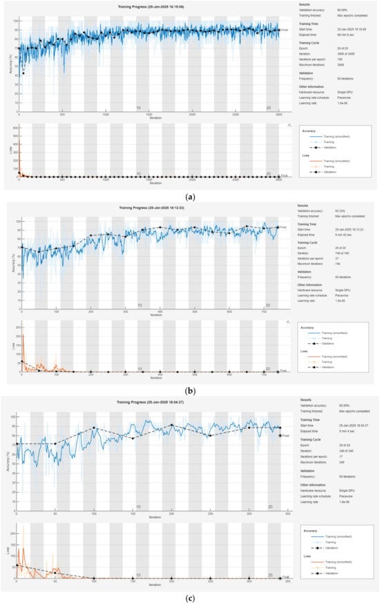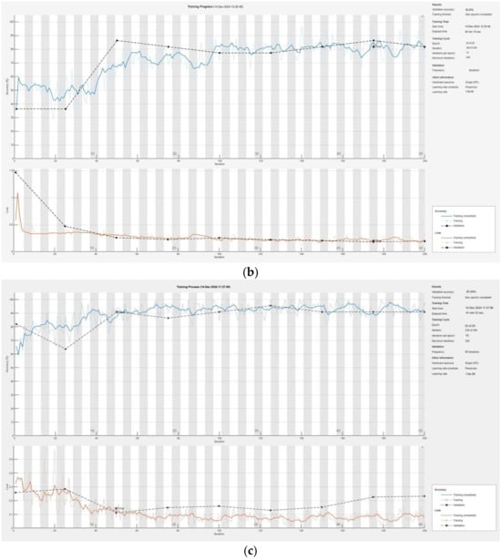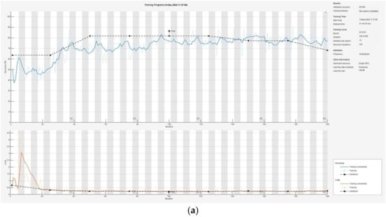 In order to compare the achieved result, we use a comparison with three other neural networks. The first neural network with which we compare is a single CNN, in which we feed the same data in the form of images. The training data are displayed in Table 1, and the training process (including the number of iterations, the number of epochs, the obtained accuracy, and validation lost) is shown in Figure 7a. In exactly the same way, a comparison was made with another neural network created for image recognition, GoogLeNet [,]. The same images are used for its training that were used in all previous neural networks. The training data are given in Table 1, and the training process with the corresponding data is given in Figure 7b. Similarly, another neural network for image recognition, AlexNet [,,], was used. The data are similarly indicated in Table 1 and Figure 7c.