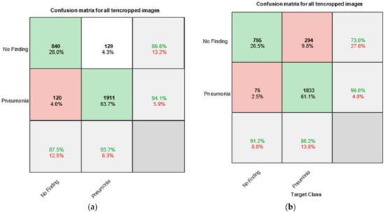 For instance, in Figure 8a, the cell located in the second row and second column displays values that reflect the correctly classified X-ray images of pneumonia from the total of 3000 images. The reported values are 1911 (63.7%), which means that when testing the entire set of 3000 X-ray images, 1911 were labeled as “Pneumonia” and were correctly classified by the system as such. This corresponds to 63.7% of the total dataset (i.e., 3000 × 63.7% = 1911).