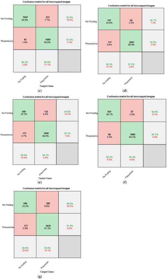 Figure 8 presents the confusion matrices, also known as error matrices, obtained by testing the trained networks with the test dataset. The chart is divided into several sections. The upper-left part consists of four cells labeled as follows: the first row contains the label “No Finding”, while the second row contains the label “Pneumonia”. The columns are labeled in the same manner—“No Finding” in the first column and “Pneumonia” in the second column.