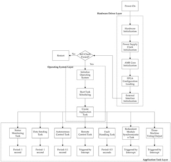 Based on the comprehensive design considerations, this system adopts a passive triple modular redundancy (TMR) architecture where three modules cross-monitor outputs, perform majority voting, and isolate faults. The ARM software (version 1.0) implements redundancy management tasks to synchronize operations across the three ARM modules, execute consensus-based output validation through a software voter, and autonomously isolate defective components, thereby ensuring fault-tolerant system behavior.