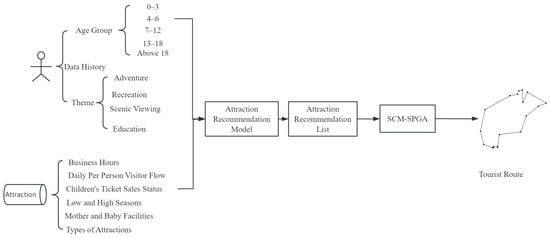 The innovation of this paper lies in the proposal of a multi-factor attraction recommendation model based on children’s age, tailored for the parent–child tourism scenario, and the design of the SCM-SPGA algorithm for path planning. This approach improves the accuracy and applicability of route recommendations. By applying the method to a dataset of Hainan tourist attractions, personalized, age-appropriate attraction recommendations and optimized routes are provided for parent–child tourists in Hainan, meeting diverse needs and enhancing the travel experience.