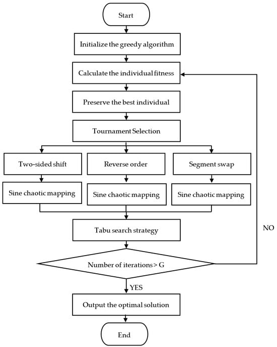 The sine mapping operator can improve the mutation operation and enhance the algorithm’s deep optimization ability. This study combines the sine mapping operator with the single-parent genetic algorithm [,] (SPGA) to fully leverage its advantages. It eliminates the crossover strategy typically used in traditional genetic algorithms, maximizing the benefits of the mutation operator. In addition, traditional operators such as greedy initialization [], tabu search [], and shift-reversal-swap combination operators [] are incorporated. The final result is the proposed Single-Parent Genetic Algorithm based on Sine Chaotic Mapping (SCM-SPGA). The basic steps of the algorithm are as follows: