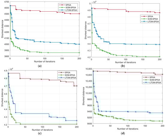To verify the improvement effect of the sine chaotic mapping operation and explore its role in enhancing the convergence speed and global search capability of the genetic algorithm, this experiment selected four standard datasets from the TSPLIB library (Tsp225, Lin318, U159, and Rat783) for testing. The experiment followed the steps described in Section 3.2.3, with parameters set to G = 200 iterations and NP = 300 population size. Through comparative experiments, the performance of the sine chaotic mapping operator (SCM-SPGA), Logistic–Tent chaotic mapping operator (LTCM-SPGA), and the traditional single-parent genetic algorithm (SPGA) were compared, with the experimental results shown in Figure 3.