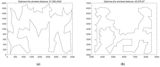 - Check whether the current iteration count is less than the maximum iteration count, G. If it is, execute Step 3; otherwise, exit the genetic mutation loop, output the individual with the shortest path in the current population, and plot the curves of the shortest path and fitness changes concerning the number of iterations.