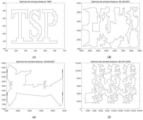 Solution results of 6 instances solved by SCM-SPGA. (a) Kroa100, (b) U159, (c) Tsp 225, (d) Pr299, (e) p654, and (f) pr1002.