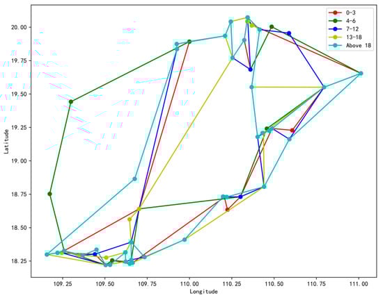 Planning for tourism scenarios. In response to user preferences, Mou [] proposed a path planning model that combines personalized visitor preferences, significantly improving the accuracy of path recommendations by modeling visitors’ attraction interests based on historical behavior data. Wang Z. et al. [] combined collaborative filtering algorithms with geographic location data to construct a path-planning model based on user preferences. This model can provide personalized recommendations based on different visitors’ interests and behaviors, significantly improving the accuracy of recommended paths and user satisfaction. For real-time dynamic path updates, Li J. et al. [] pointed out that the application of the Internet of Things (IoT) and big data provides new possibilities for real-time path planning. By collecting real-time data on factors such as crowd flow and attraction weather conditions, paths can be dynamically adjusted to avoid overcrowding and improve visitor comfort. Ding et al. [] proposed a real-time path planning system based on IoT mobile devices, which integrates GPS positioning and user preference analysis to provide real-time path optimization suggestions.