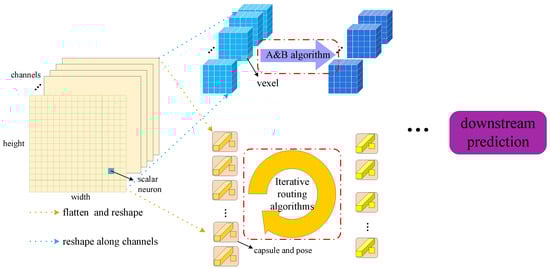 Pose and activation. Capsules and vexels both extract features into poses, which indicate the relative transformations between observer’s coordinate frame and the world’s coordinate frame; therefore, they both try to represent objects as spatial relationships between the object’s parts and the whole object. As for activation values, which are necessary for artificial neural networks imitating the mechanism of the human neural system, in [], the activation of a capsule is denoted by its norm. At the same time, in [,,], a separate scalar is introduced to represent the activation for a capsule, relatively decoupling the routings of activation values and poses. After comparing the prediction performance, we determined activation values by their norms.