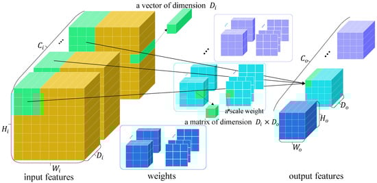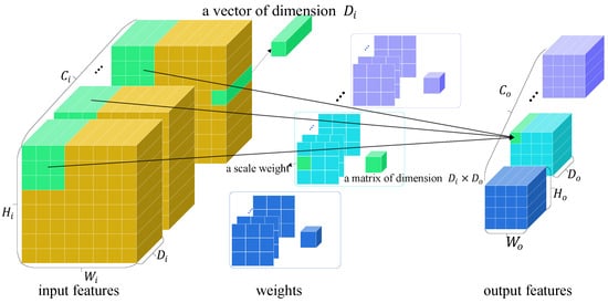For friendly comprehension, we show the calculation of a vexel located at in the sth channel output features by Equation (13). At sliding step , , i.e., the bias matrix weights corresponding to calculating the sth channel output features, covers a region across all channels on input features centered at position , i.e., the receptive field, conveniently denoted as , the height, width, and channels of which equal to those of separately. Then, every vexel in is affinely transformed by the corresponding matrix in through matrix multiplication.