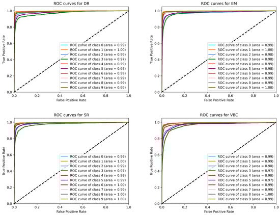 ROC curves of four CapsNets on CIFAR-10. This figure shows the ROC curves of Dynamic Routing, EM routing, Self-Routing, and Variance Bayes Inference capsule networks.