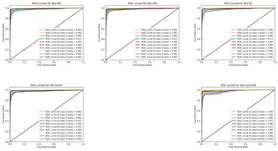 ROC curves. Figure 7 and Figure 8 show the ROC curves for CapsNets and VexNets, respectively. Table 5 reports the average per-class Area Under the ROC Curve (AUC) on CIFAR-10—higher AUC indicates better class separability. VexNet with all channel-shared kernel operators achieved 0.989 average AUC, surpassing Dynamic Routing CapsNet (0.988) and Variational Bayes CapsNet (0.985) and matching EM Routing CapsNet (0.989). The vexel-wise and channel-wise variants reached 0.988, outperforming Variational Bayes and equaling Dynamic Routing. Self-Routing CapsNet led with 0.992 among the baselines, while Variational Bayes CapsNet had the lowest AUC (0.985). When considered alongside substantially fewer parameters and FLOPs (see Table 4), these results demonstrate that VexNets deliver competitive or superior discriminative performance with greater computational efficiency.
