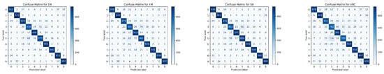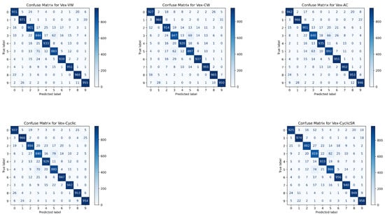 Confusion matrices. Figure 9 and Figure 10 show the confusion matrices for capsule networks and VexNets, respectively. Each confusion matrix illustrates the matching between predicted and true labels, with larger diagonal values indicating more accurate predictions. Compared to their CapsNet counterparts, VexNet variants consistently exhibited higher diagonal entries, indicating improved class discrimination and more accurate label assignment.