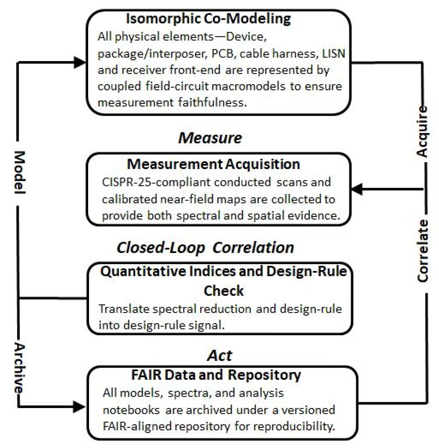 Figure 1. The workflow integrates modeling, measurement, and validation within a coherent closed-loop framework that links design actions to quantitative EMC outcomes. It starts from isomorphic co-modeling and CISPR-25-compliant measurements, proceeds through closed-loop correlation and computation of compact indices, and culminates in FAIR-aligned data management to ensure reproducibility, traceability, and design-stage applicability.