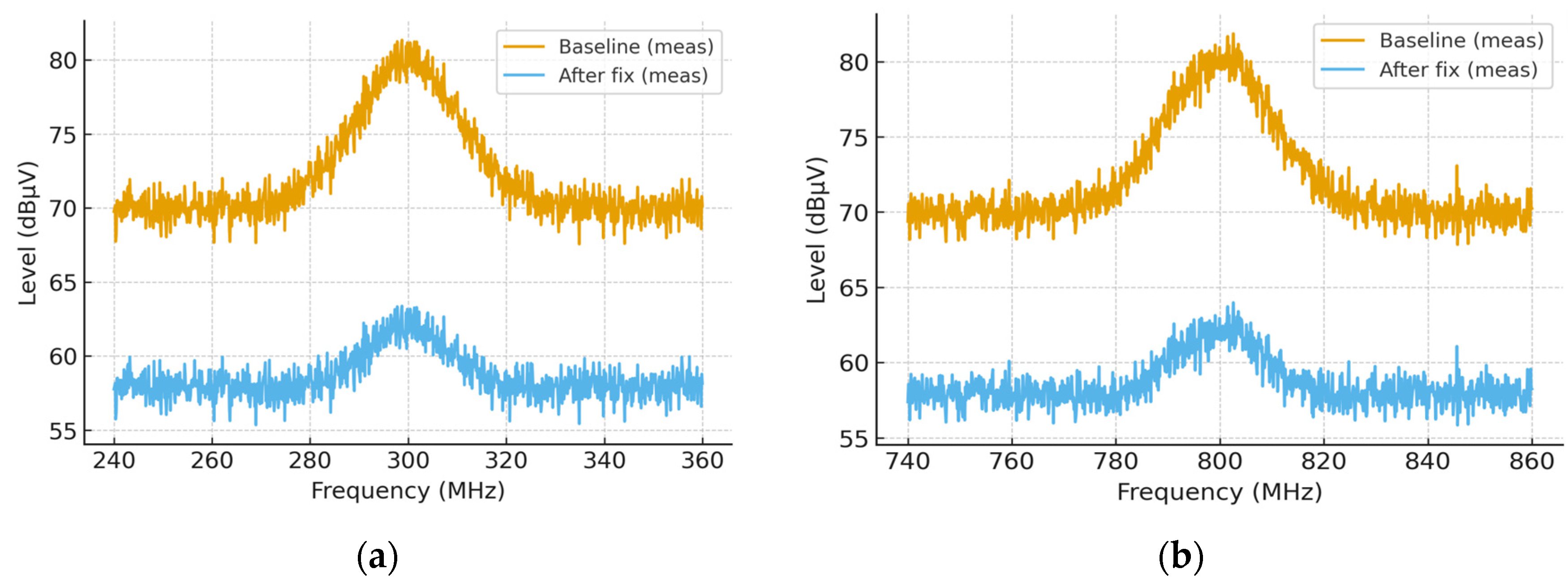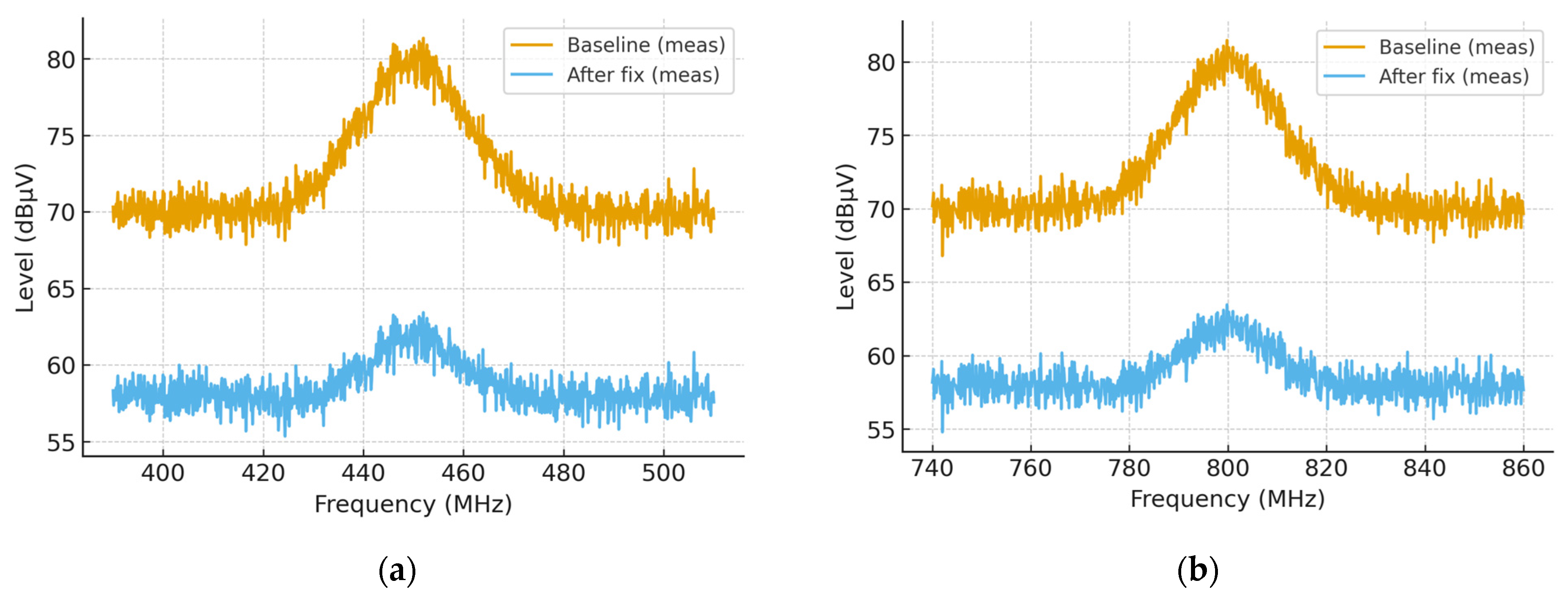 Figure 7a shows a baseline peak of 73.5 dBµV and a mitigated level of 71.8 dBµV, yielding Δ = −1.7 dB. The ≈800 MHz window in