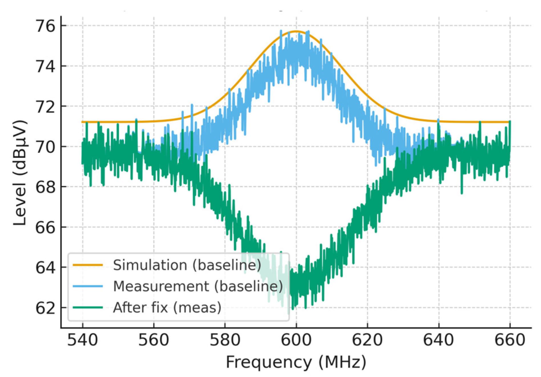 Baseline agreement between prediction and measurement satisfied the closure criterion. The co-model predicted a peak of 71.2 dBµV, and the measured baseline was 69.6 dBµV, yielding Δ = −1.6 dB, which lies within the combined 1σ