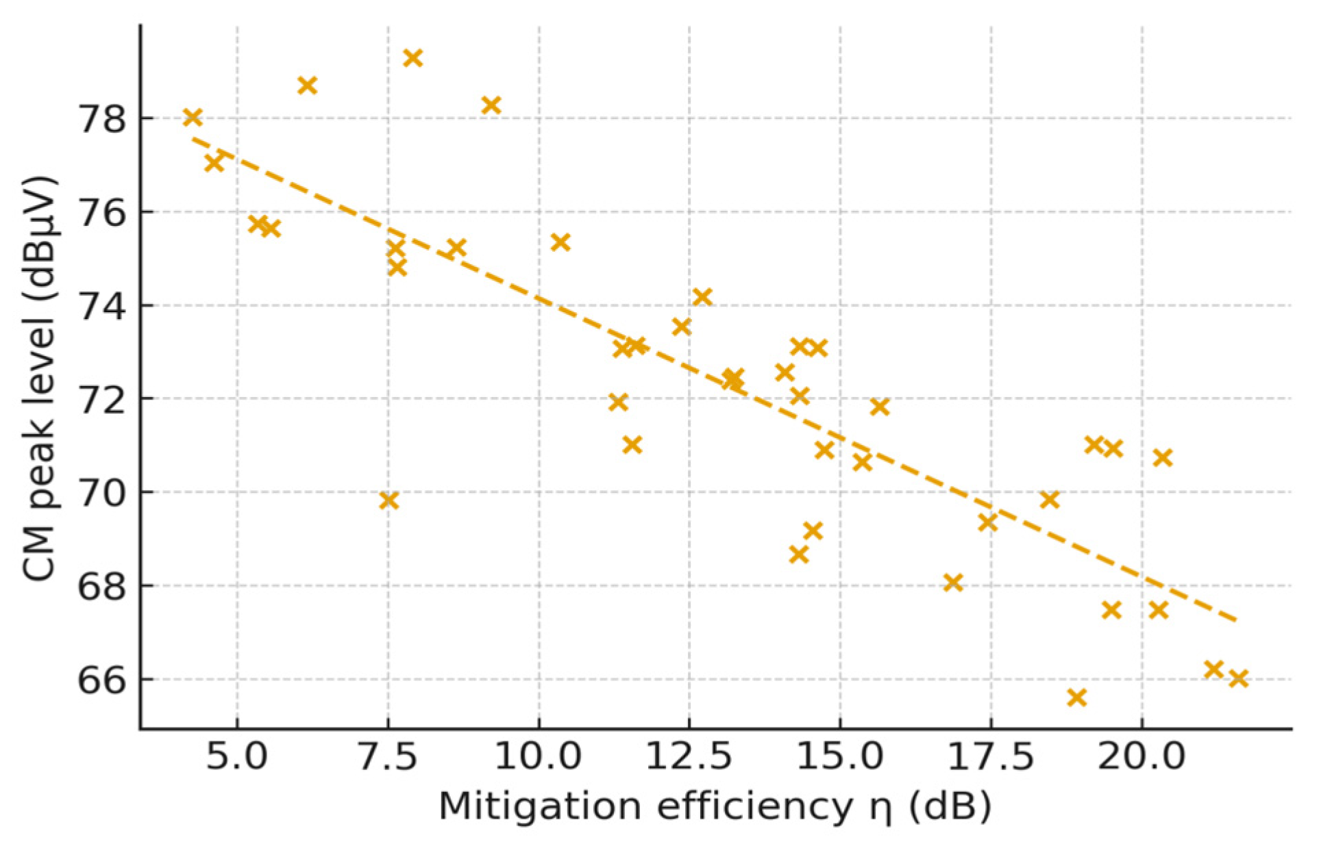 and common-mode (CM) peak level across 40 operating/layout points pooled from the test boards. The scatter plot is a derived statistic and therefore does not employ receiver settings (RBW = N/A, Detector = N/A, Distance = N/A, Grid = N/A). Band-wise correlations were strong at the primary windows: r = 0.85 at