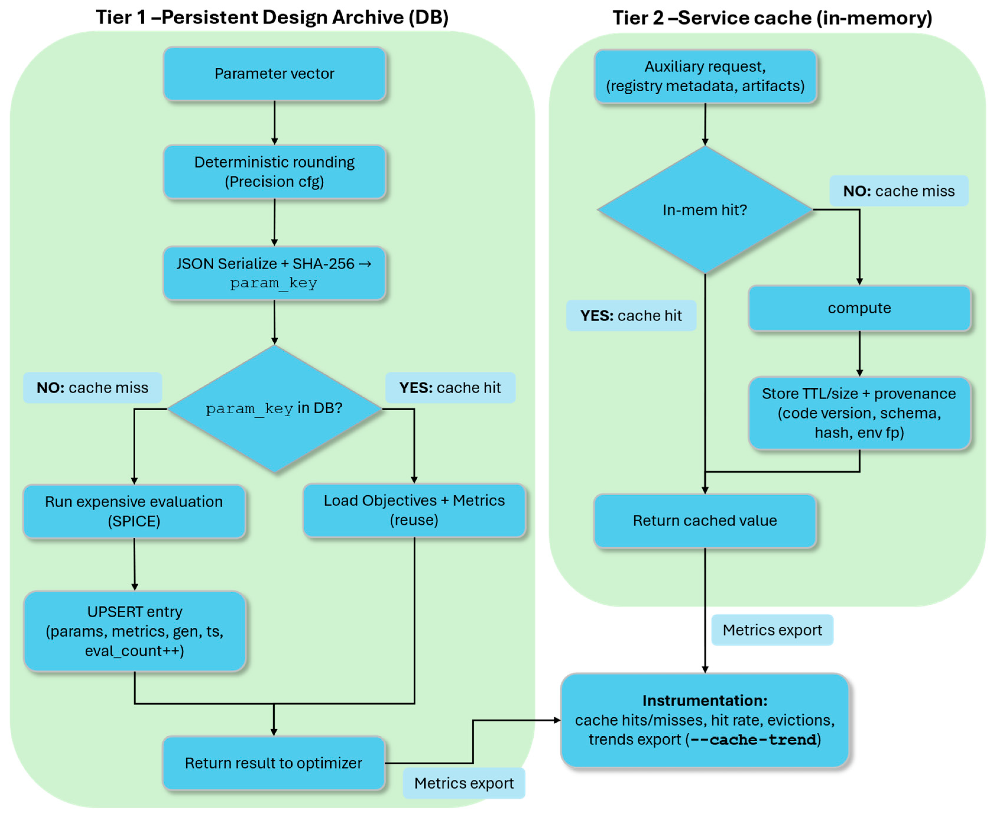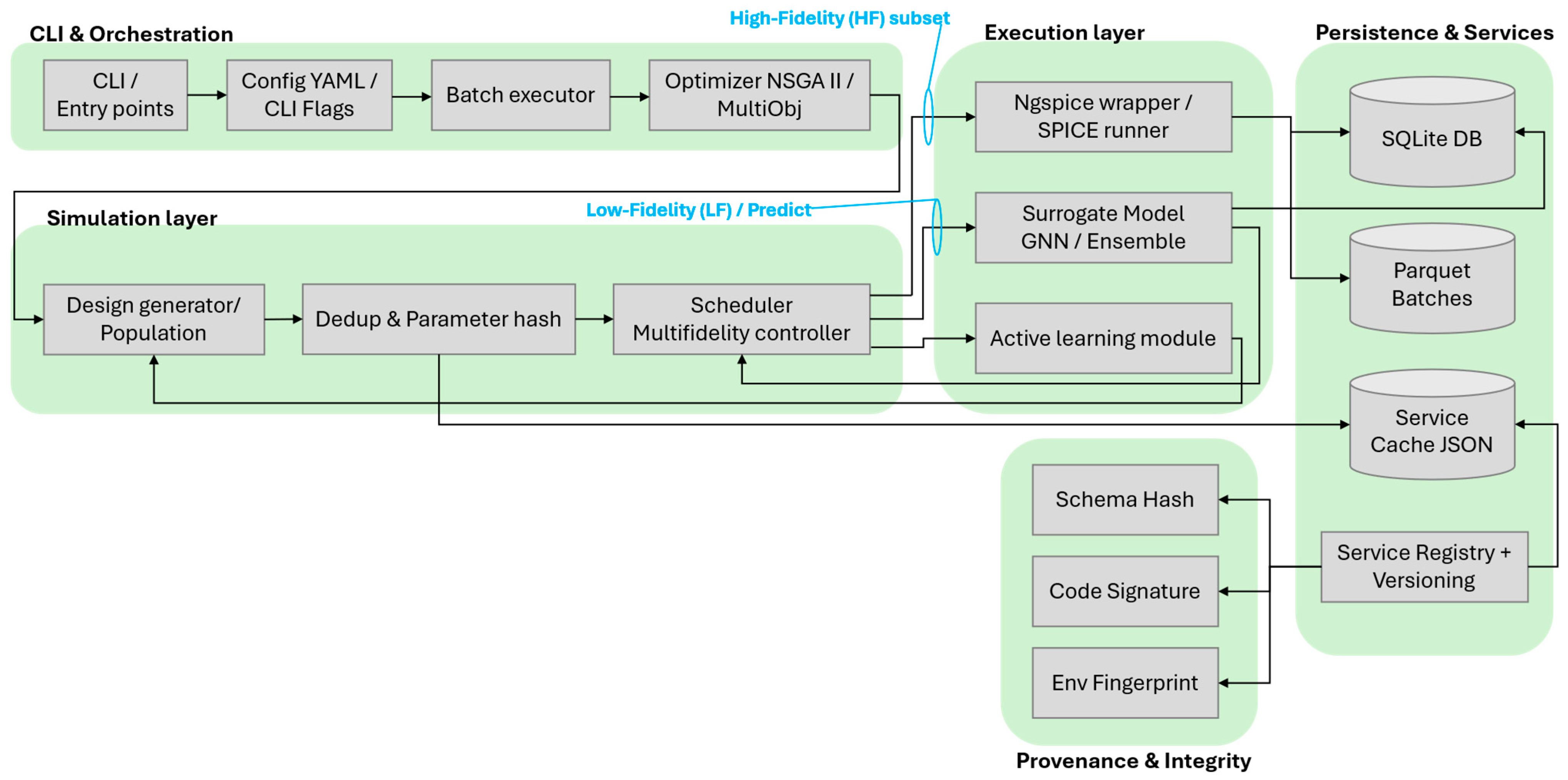 - Simulator-in-the-loop orchestration: The surrogate is embedded in a multi-fidelity optimization loop that periodically validates and corrects predictions with Ngspice simulations, ensuring that model drift and overconfidence are detected and mitigated. The loop also includes deterministic caching, deduplication, and selective parallel dispatch of uncached simulations, and drives early stopping via dual convergence metrics—hypervolume (HV) expansion and raw IGD reduction—to monitor Pareto spread and proximity while detecting drift or overconfidence.