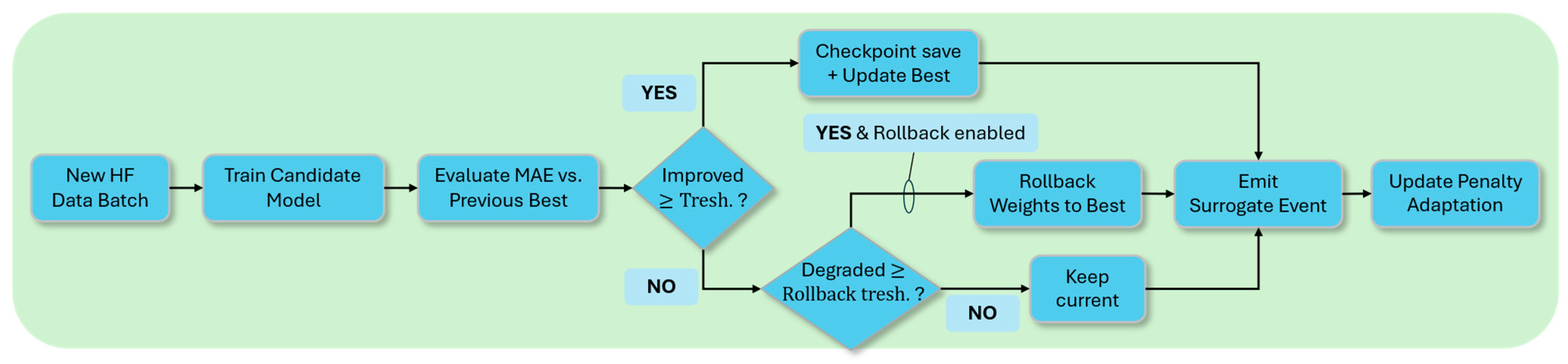 - Surrogate Retraining: The surrogate parameters are updated using the expanded dataset . This step reduces predictive bias and variance for regions that were previously uncertain.