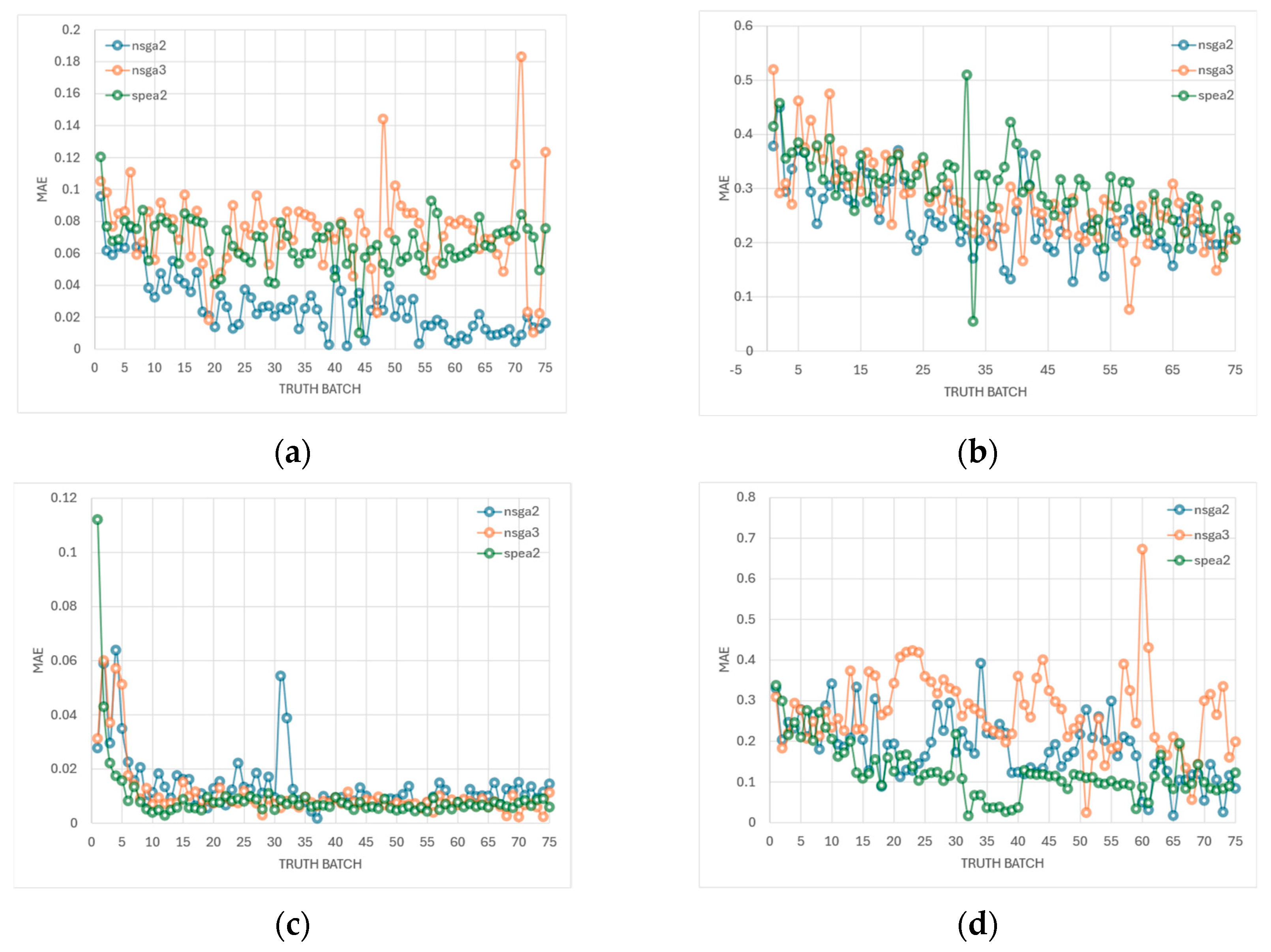 - Evolutionary Update: The batch is combined with the current population and evolved under the configured evolutionary algorithm (e.g., NSGA-II, MOEA/D, or SPEA2), producing a new population of size .
