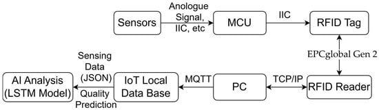 Figure 2 depicts the specific end-to-end data flow of the proposed system. Data collected from the specific food quality sensors are packetized by the MCU and transmitted via the EPC Gen2 protocol. Crucially, the diagram highlights the integration of the AIoT Cloud Platform, where raw sensing data are not only stored but also processed by the deployed LSTM machine learning model to generate real-time quality predictions. Moreover, in addition to utilizing EPCglobal Gen2, which allows unlimited user memory for communication between the RFID tag and the reader, the system employs the TCP/IP protocol for data transmission between the reader and the computer, facilitated by an RJ45 connector. Furthermore, the data collected by the computer are transmitted to the cloud IoT platform via Ethernet, utilizing the Message Queuing Telemetry Transport (MQTT) protocol. It is important to note that the maximum data capacity is primarily dictated by the size of the cloud database. Consequently, the overall data capacity of the system is closely linked to the development costs of the cloud platform.