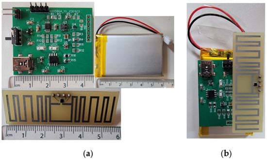 Figure 6a shows three main hardware parts of the fabricated semi-passive RFID integrated sensor and their sizes, including the battery, main PCB for data collection and processing, and antenna for RFID communication. The assembled hardware is shown in Figure 6b.