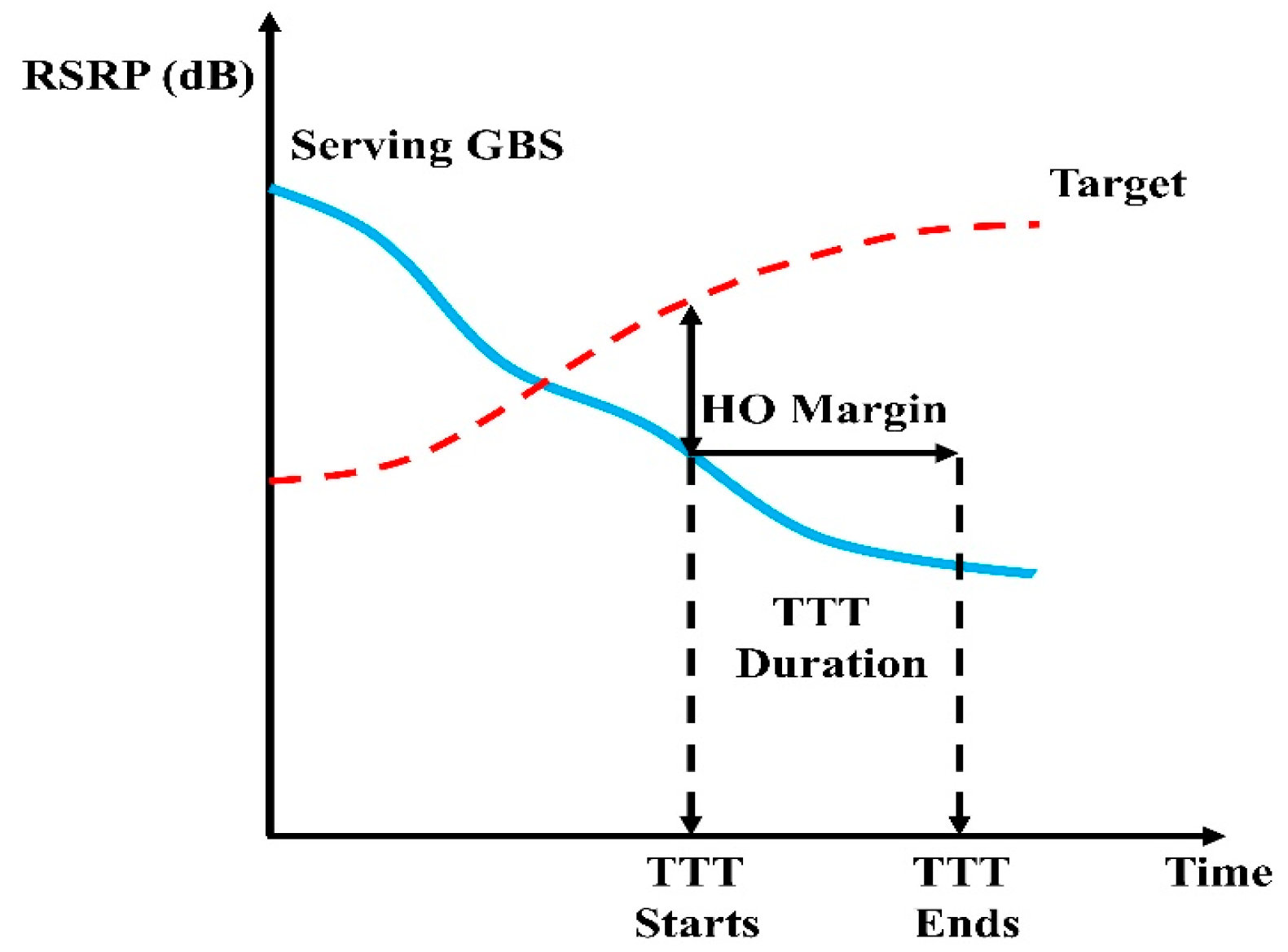 13]. In standard cellular networks, the 3GPP A3 event-based handover method triggers a handover when the signal from a neighboring cell becomes stronger than the serving cell by a predefined margin. While this method is simple and widely used, it often causes unnecessary handovers or link failures under high mobility and interference conditions, such as in UAV scenarios.