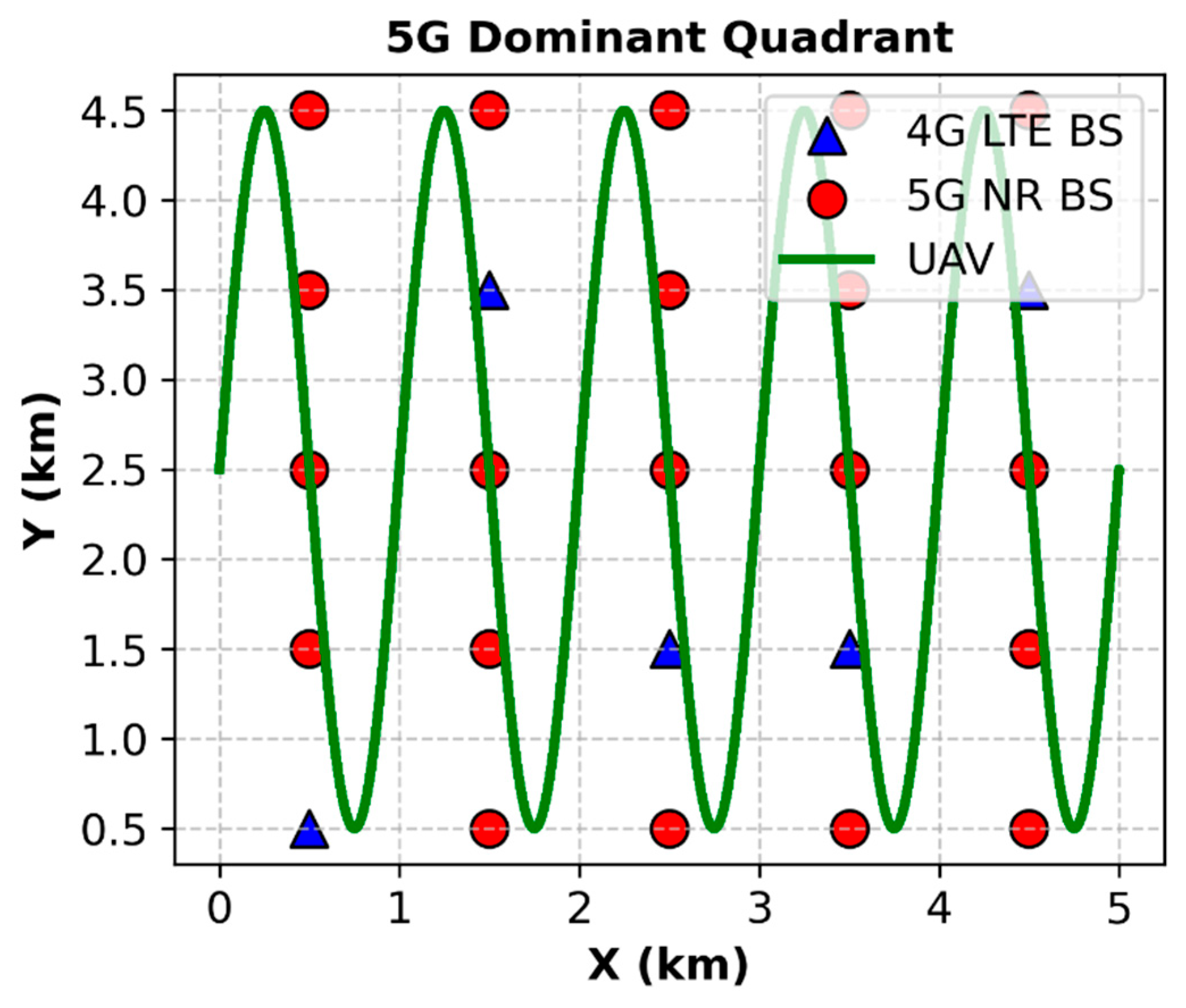 11]. The framework is evaluated in a 10 km × 10 km simulated area containing a heterogeneous network of LTE and 5G NR BSs. Four UAVs operate within 5 km × 5 km quadrants, following sinusoidal trajectories with a total flight path of about 38.2 km. Network parameters are sampled every 100 ms over a 1376-s period. The dataset, generated using the 3GPP TR 36.777 UMa channel model, includes LOS/NLOS transitions and a frequency reuse-7 scheme, providing realistic conditions for developing and testing intelligent handover strategies [