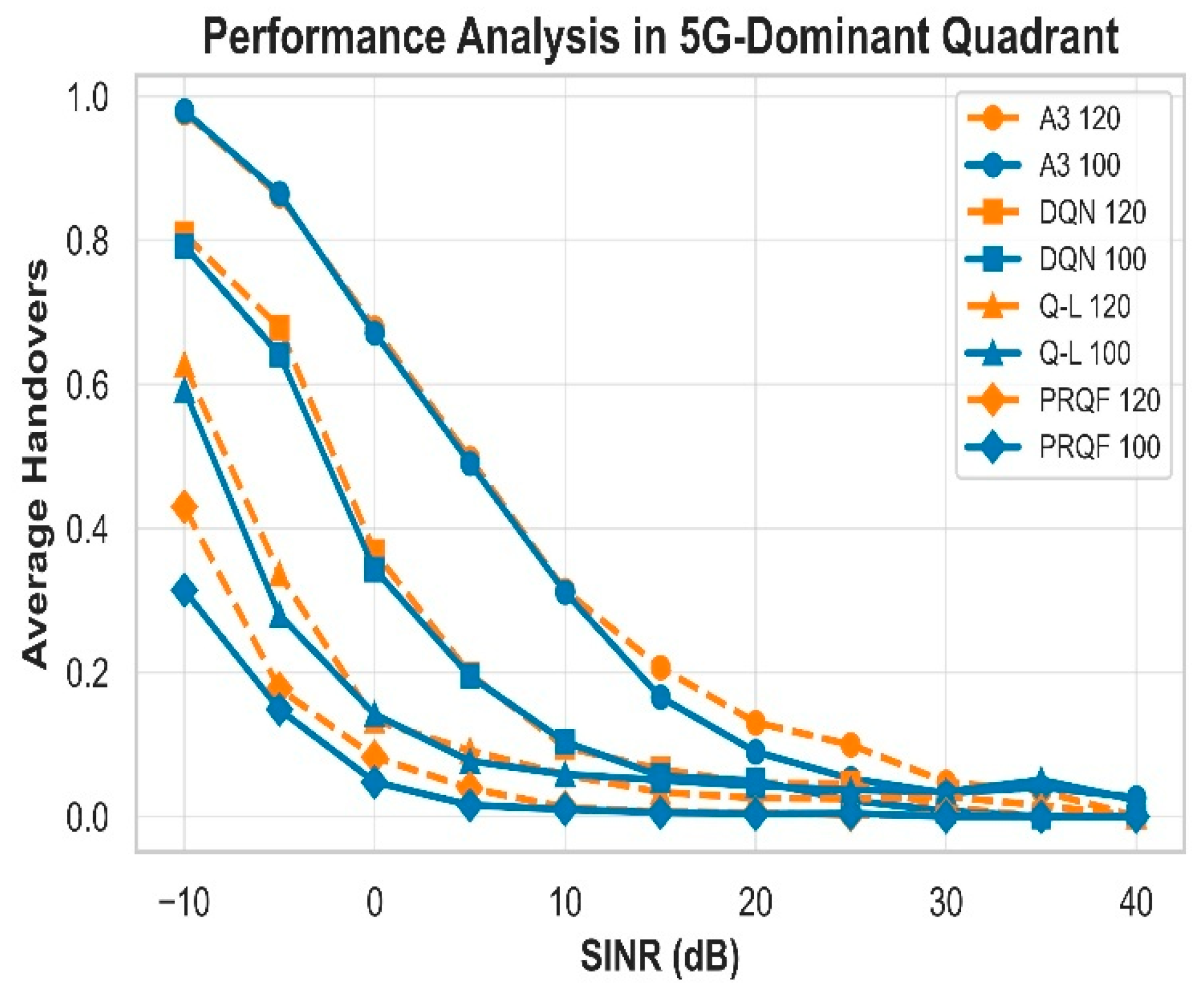 25] achieves lower reductions of 58% at 100 km/h and 59% at 120 km/h. While DQN provides improvements over conventional A3-based handover strategies, its performance is notably lower than the proposed method, highlighting the added value of the Q-learning and PRQF hybrid framework.