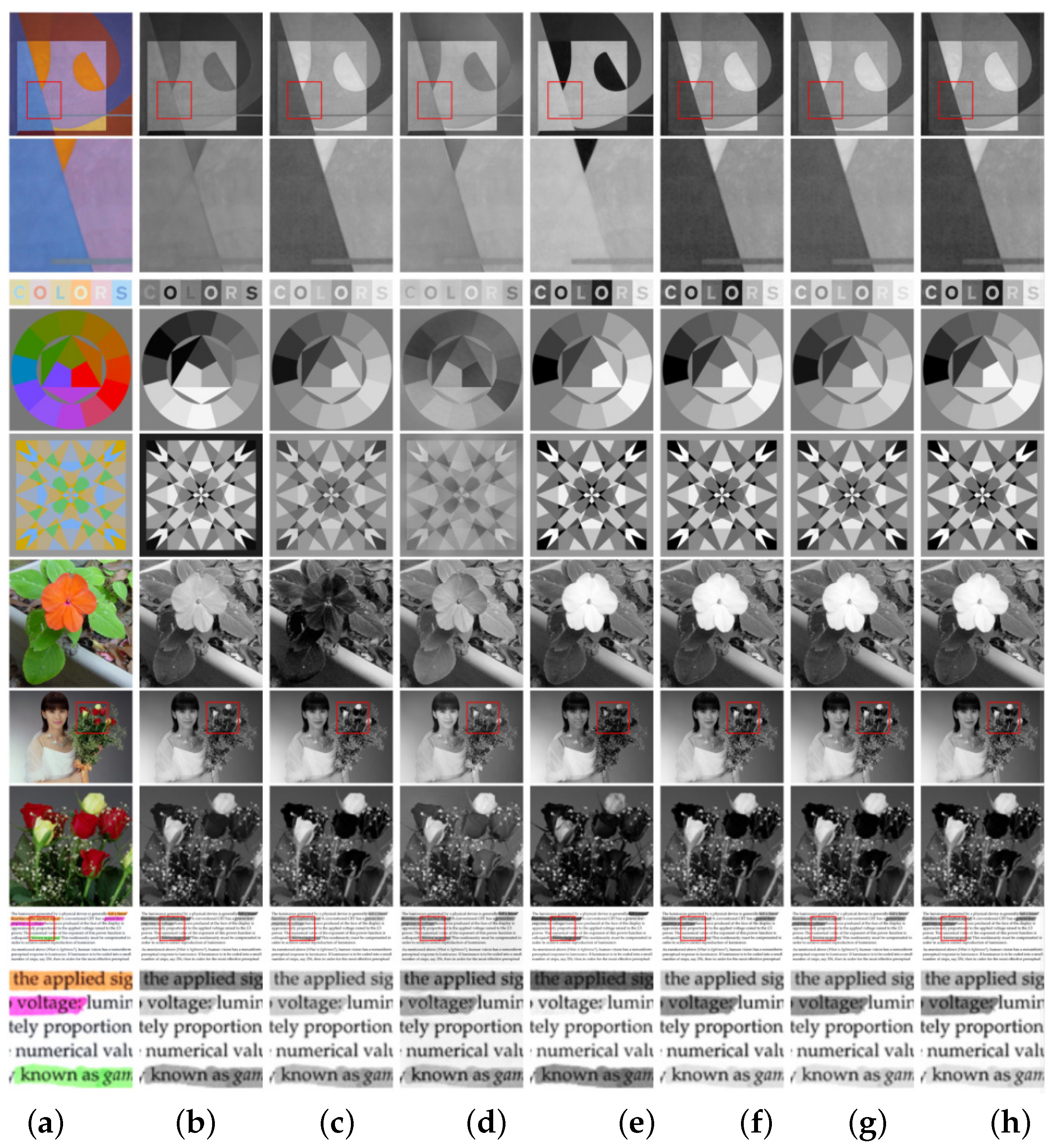 - Nafchi, H.Z.; Shahkolaei, A.; Hedjam, R.; Cheriet, M. CorrC2G: Color to Gray Conversion by Correlation. IEEE Signal Process. Lett. 2017, 24, 1651–1655. [Google Scholar] [CrossRef]
