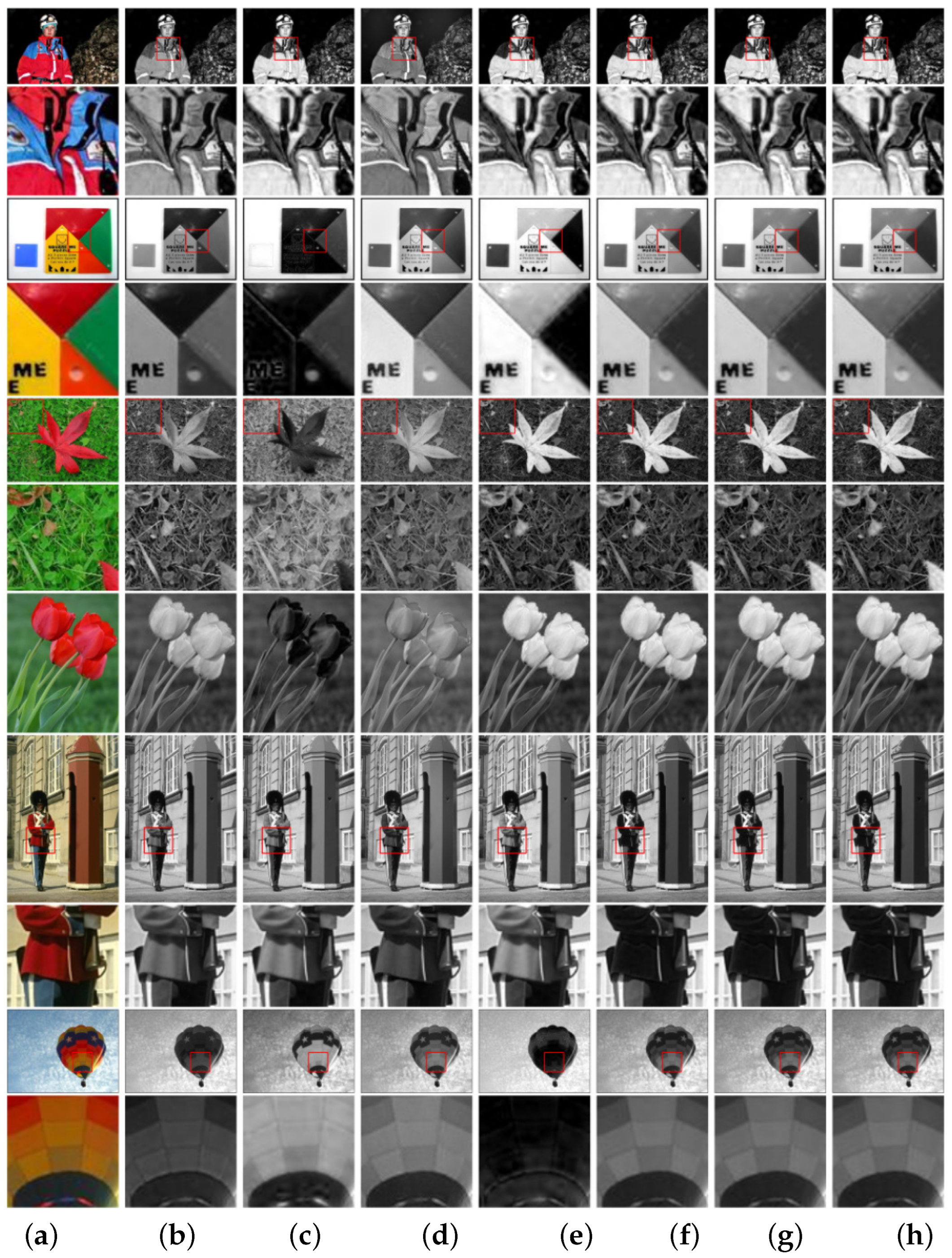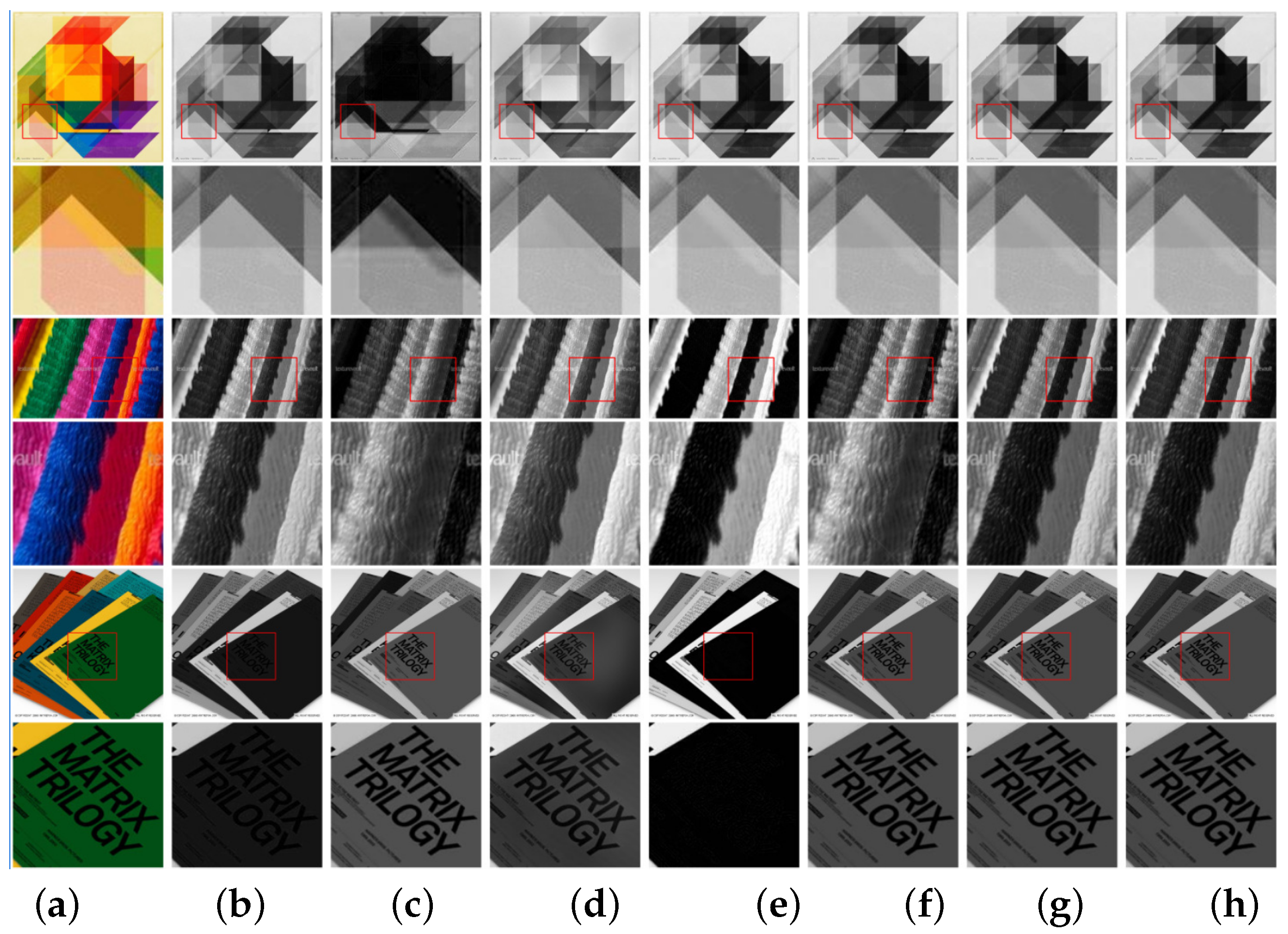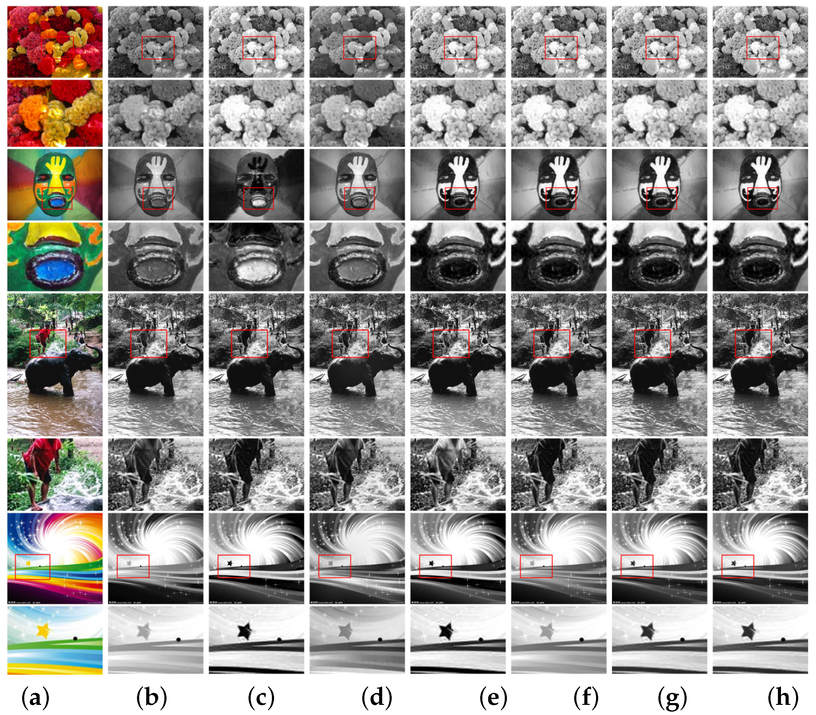 - Yu, N.; Li, J.; Hua, Z. Detail enhancement decolorization algorithm based on rolling guided filtering. Multimed. Tools Appl. 2022, 81, 2711–2731. [Google Scholar] [CrossRef]