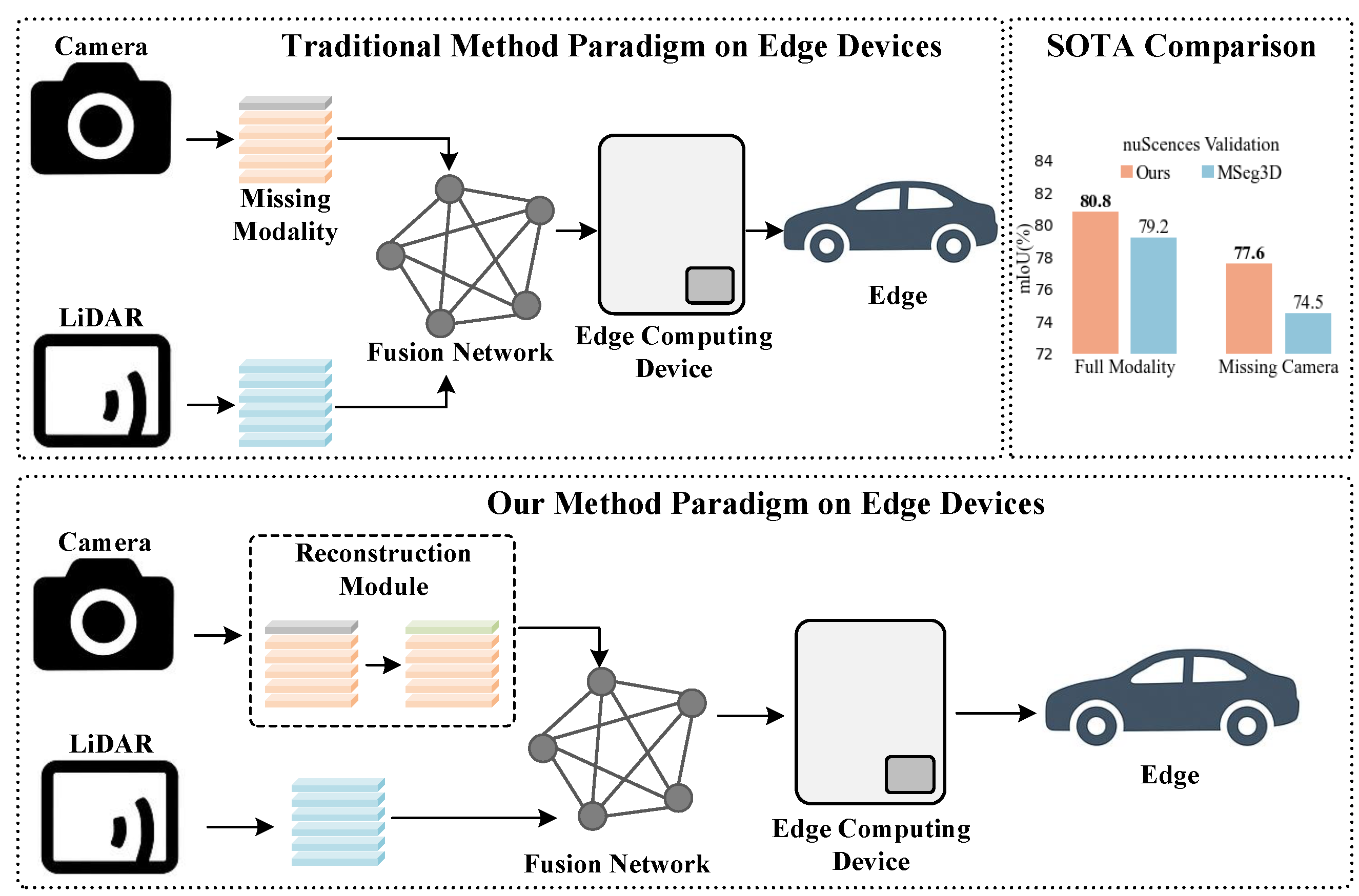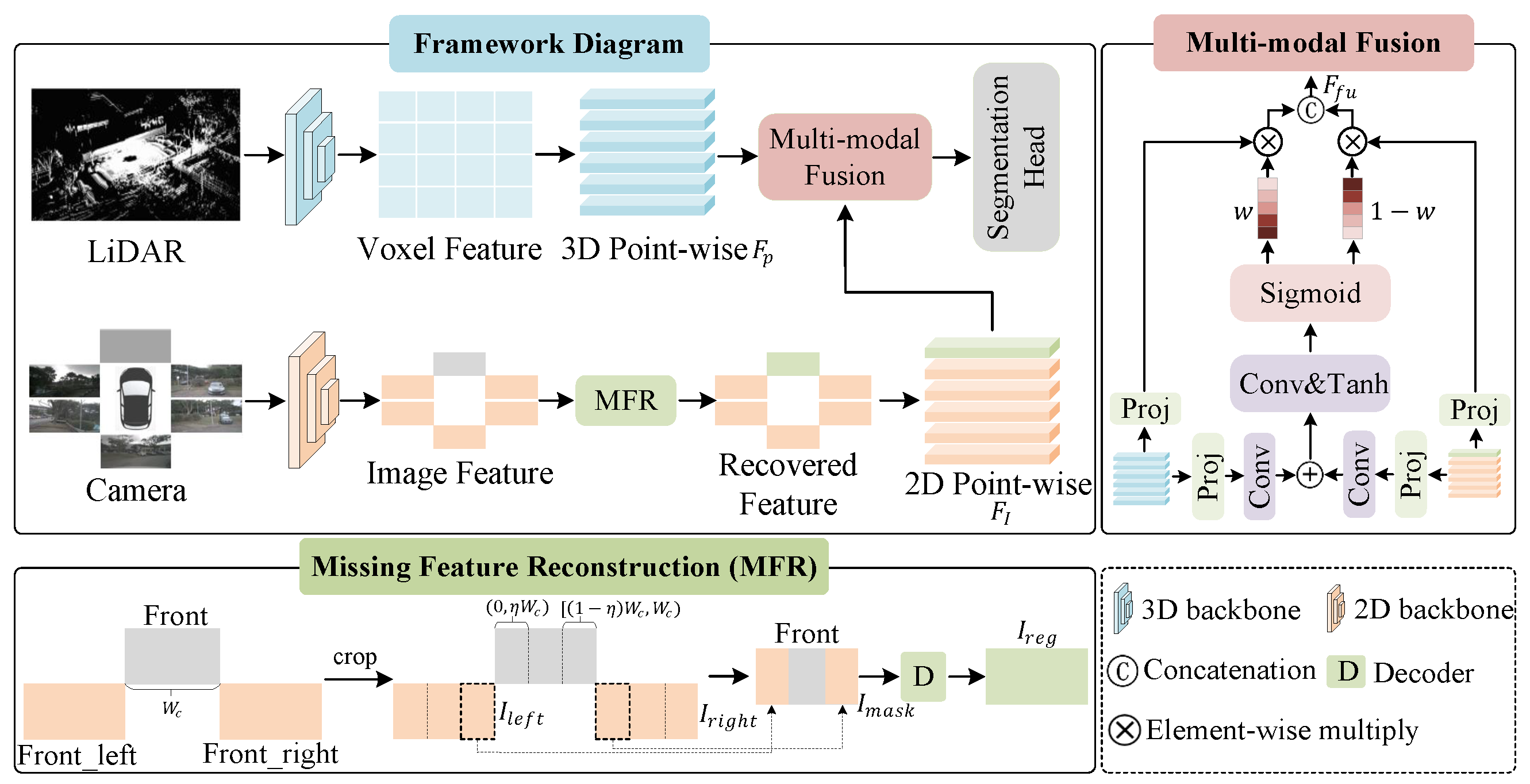 - We design a missing feature reconstruction mechanism that exploits intra-modal feature correlations to recover missing camera representations, thereby alleviating performance degradation. Furthermore, we introduce a cross-modal adaptive fusion strategy that learns adjustable weights to fuse image and LiDAR features, improving the efficiency and reliability of cross-modal information interaction.