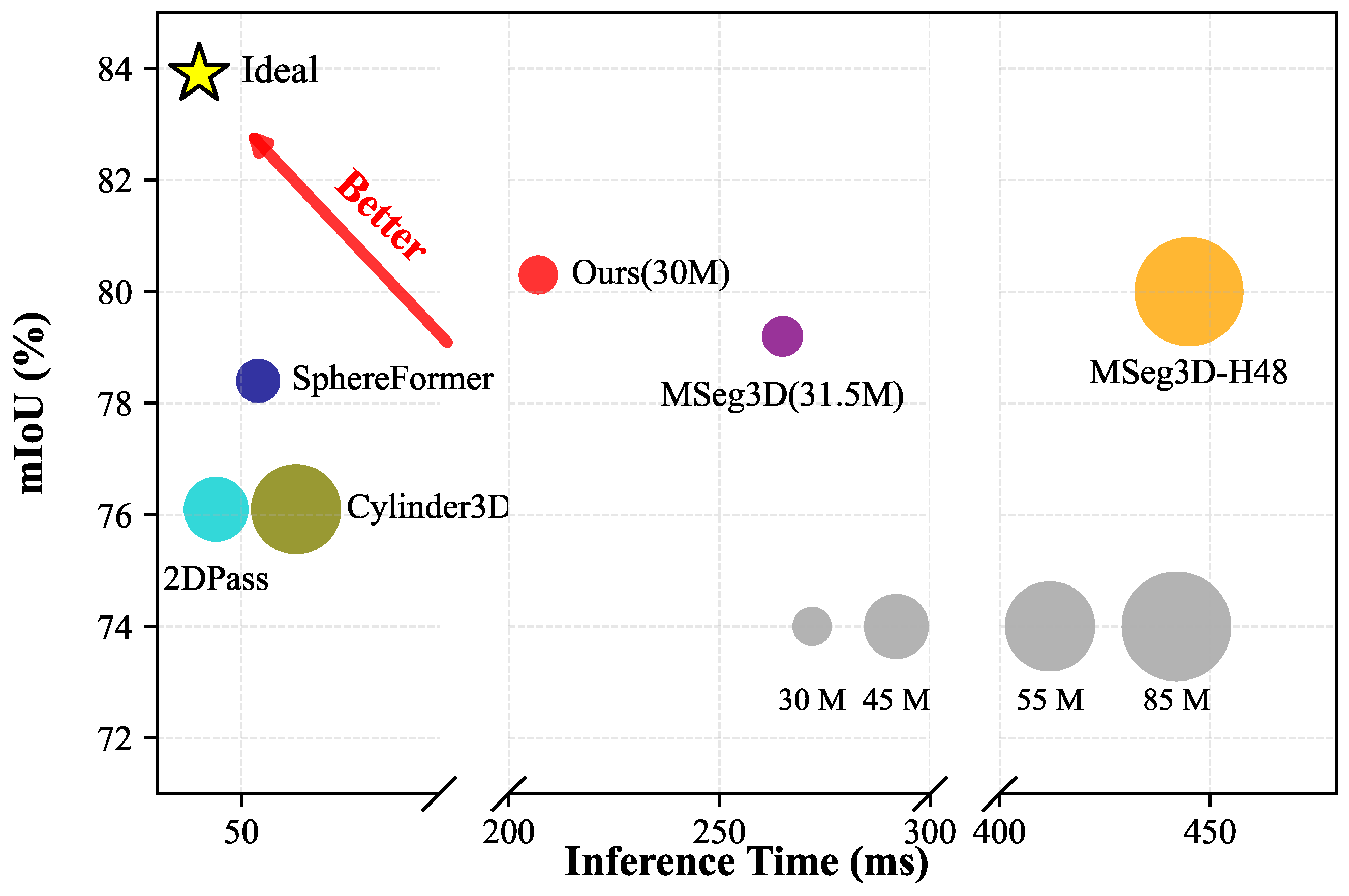 | SphereFormer [18] | 78.4 | 77.7 | 43.8 | 94.5 | 93.1 | 52.4 | 86.9 | 81.2 | 65.4 | 73.4 | 85.3 | 97.0 | 73.4 | 75.4 | 75.0 | 91.0 | 89.2 | |