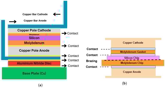 A typical power semiconductor packaging design for high-power PCT insulated module diodes and advanced PCT press-pack diodes consists of a multilayer structure with different materials, as shown in Figure 5.