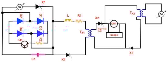 Experimental tests were carried out on a PCT press-pack diode and a PCT insulated diode model, both from the same manufacturer and unused, with ratings of 4400 V and 4500 V, respectively. The devices had similar specifications and featured chip diameters of 48 mm. The experimental setup, designed in accordance with the IEC 60747–2 standard [43], as illustrated in Figure 6, is designed to generate controlled surge current pulses using a single-phase full-wave rectifier connected to a transformer Tx1 via a resistor R1 and an inductor. The surge current, as shown in Figure 7, ranging from 6400 A to 36,700 is generated through a resistor–capacitor (RC) charge–discharge mechanism. To mitigate the risk of explosion at very high currents, the equipment is enclosed with a protective grille, as illustrated in Figure 8. Moreover, an external DC power supply charges the capacitor C1, while the flow of the current is regulated by a set of thyristors X1, X2, X3, and X4.