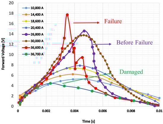 A series of surge current tests was performed experimentally, as discussed in Section 4.1. The test started at a lower-level current, having a peak amplitude of 6.4 kA and gradually increased until device failure. For each surge level, the corresponding forward voltage drop was recorded to monitor the electrical response of the device, as shown in Figure 9 and Figure 10. After the surge test, electrical tests were carried out that confirmed that the diode’s electrical characteristics were only slightly changed compared to prior characteristics, confirming no performance degradation or failure in the device.