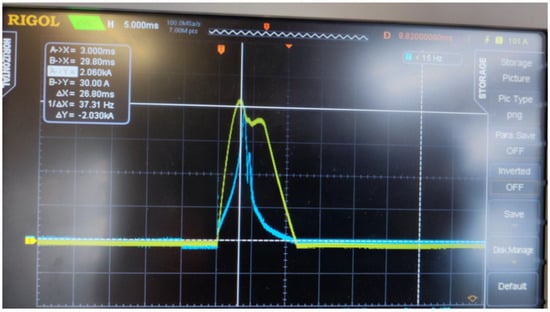 Thyristor X1 governs the charging of C1, enabling precise control over the starting and disengaging of the capacitor charge. For the positive half-cycle of the AC supply, thyristors X2 and X4 are triggered, which initiates current flow through the capacitor and inductor. At the zero-crossing point, which marks the start of the negative half-cycle, thyristor X3 is activated. As the current decreases, X2 automatically turns off, leading to polarity reversal across C1. The stored energy is then discharged through a Device Under Test (DUT), which completes the surge event. Current measurements are obtained using a Rogowski coil placed on the primary side of the transformer . Surge events are configured for a 10 ms duration using a dedicated timing control board, as shown in Figure 8. All relevant electrical parameters are captured via a four-channel digital oscilloscope, which ensures synchronized and accurate waveform acquisition.