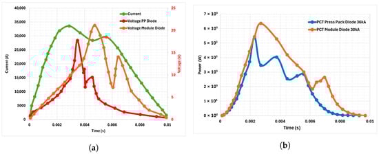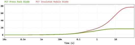 A transient thermal simulation was performed for both the PCT press-pack and insulated module diode to evaluate the temperature rise under various single half-sine peak current pulses, consistent with our previous work [45]. The simulation parameters are described in Table 3 and represented in Figure 14. The peak current amplitude was progressively increased until thermal runaway and subsequent device failure were observed.