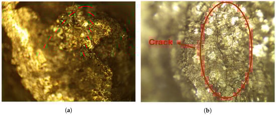 After subjecting the DUT to surge current stress and performing experimental tests, the failure mechanisms under two different scenarios were analyzed. In the case of press-pack diode, device failure, specifically micro-eroding, is primarily attributed to heating induced by the high surge current. As the surge current begins to increase, the concentration of carriers is also increased, which, in turn, increases the forward voltage drop of the device, and hence, the temperature is also increased. With further increases in surge peak, the concentration of carriers is increased, which affects the mobility of carriers, and hence, the slope of the I-V curve is slowly reduced. However, the change in the forward voltage drop of the diode remains linear until the 30 kA surge current is applied. When subjected to a 30 kA surge current, the forward voltage drop of the diode increases from 7.4 V to 13.8 V, and a minor change in the shape of the waveform is also noted. Moreover, a sharp falling time and the evaporation of metallization are noted on the silicon chip, as shown in Figure 17.