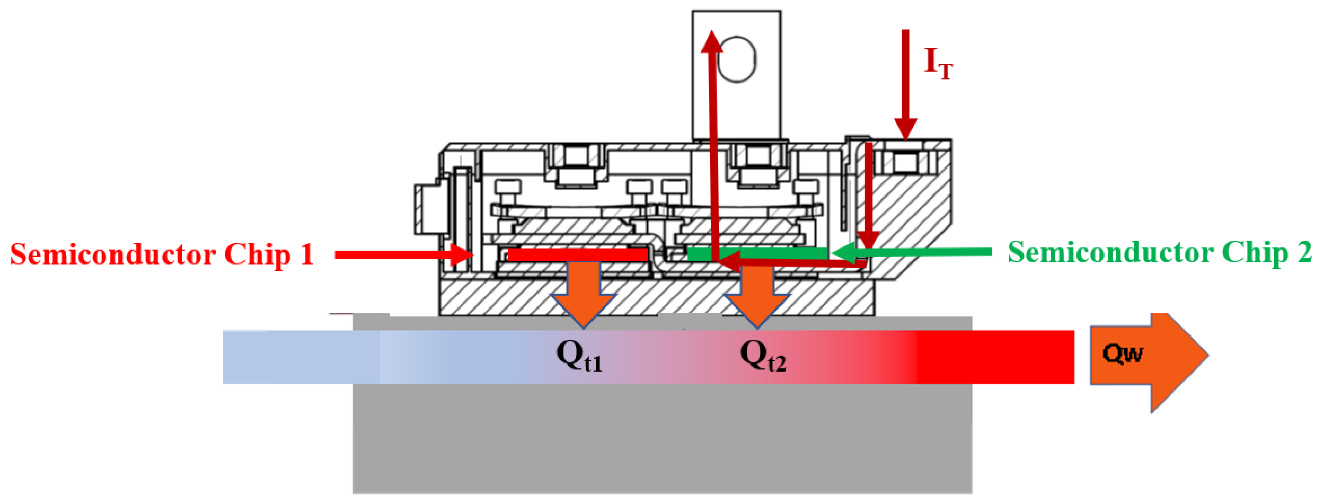 | Brazing and welding contact | Insulated module | Multi-chip, Square Shape | Diodes, IGBT, MOSFET | High modularity multichip connection in parallel. Lower costs at the same power range. Possibility of using different types of devices, including SiC. | Single-sided cooling. High junction temperature at the same dissipated current. Lower reliability. Encapsulation with resin, possibility of degradation. |
