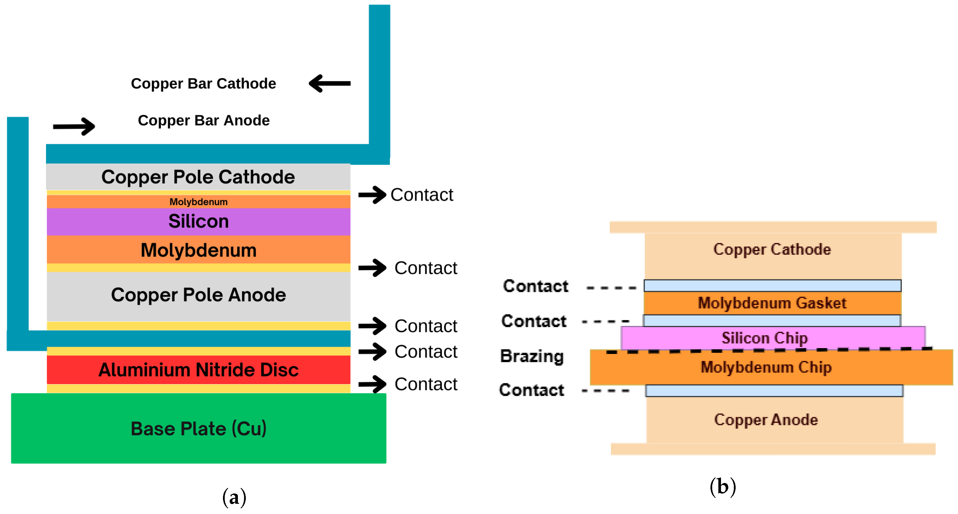 - Xiao, K.; Wang, Z.; Yan, X.; Li, W.; Liu, Y.; Liu, P. Temperature Distribution and Mechanical Stress Analysis of Press-Pack IGBT Single Chip Under Different Operations. In Proceedings of the Frontier Academic Forum of Electrical Engineering; Springer: Cham, Switzerland, 2025; pp. 789–796. [Google Scholar]