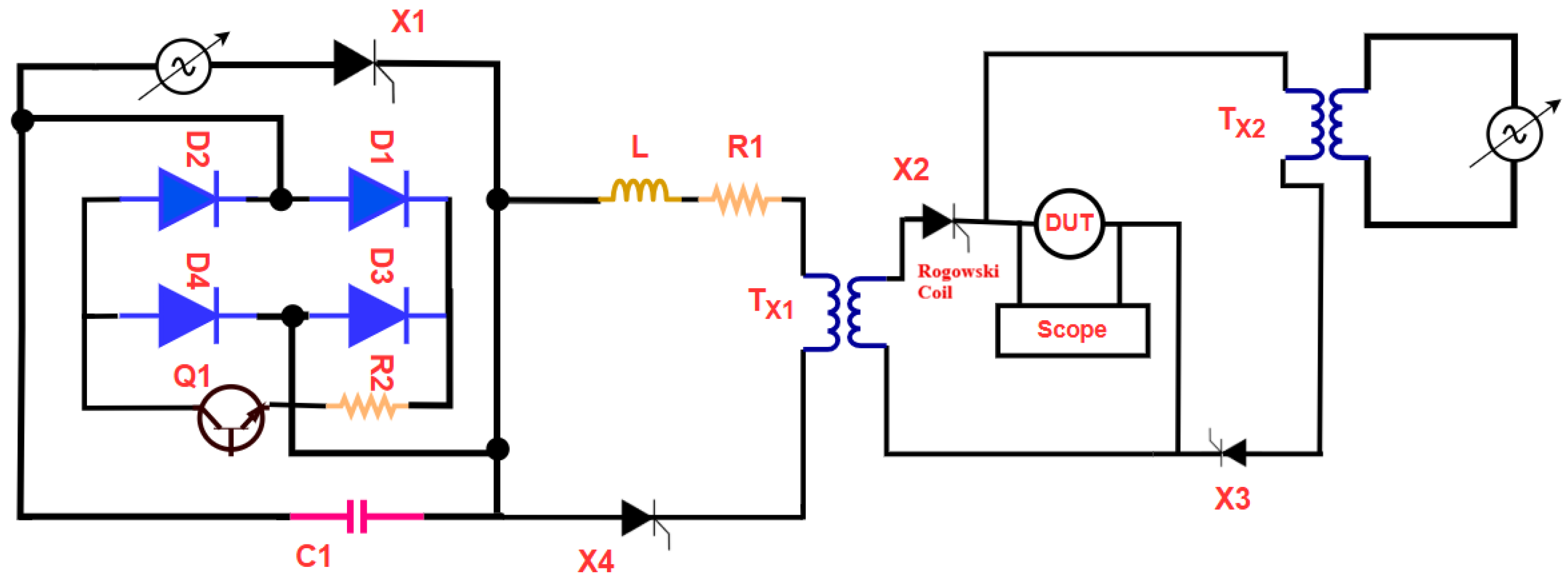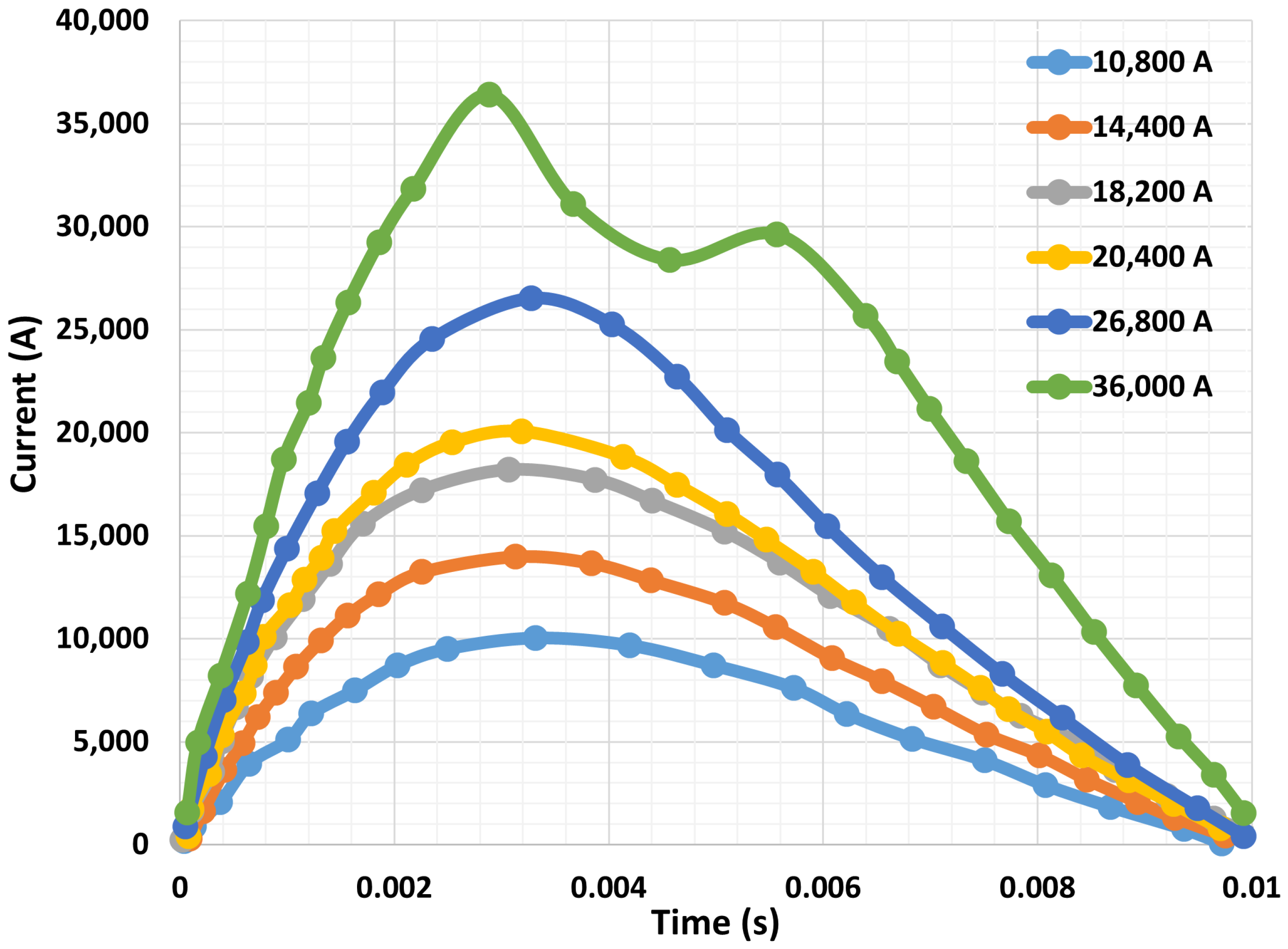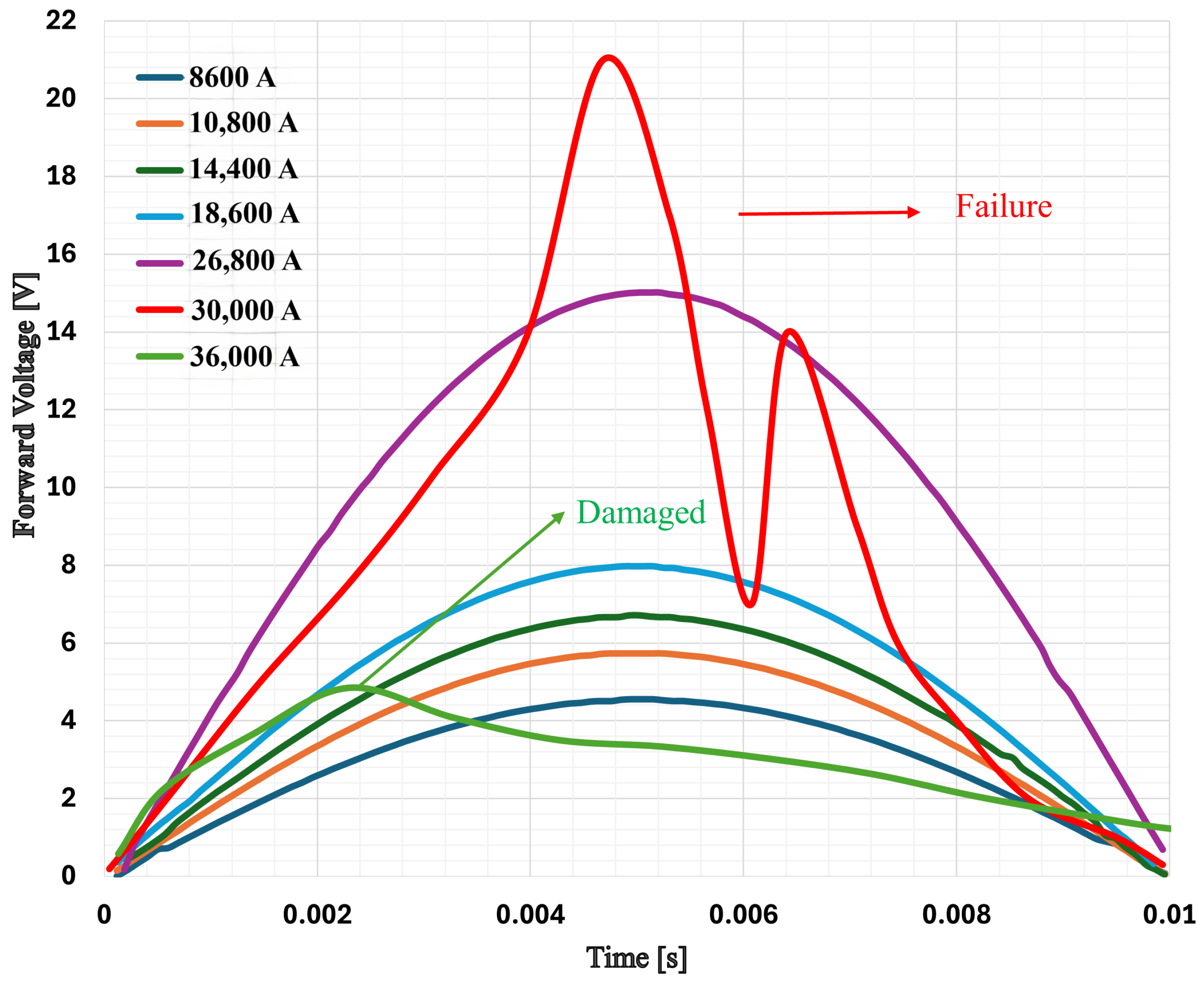 - A 10 ms high half-sine surge current waveform generator is developed both experimentally and in PSIM to analyze surge events at different power levels for both diode packaging types.