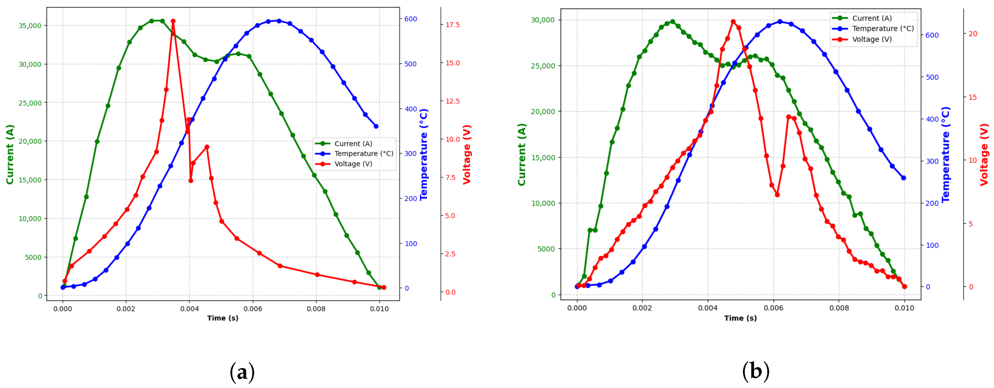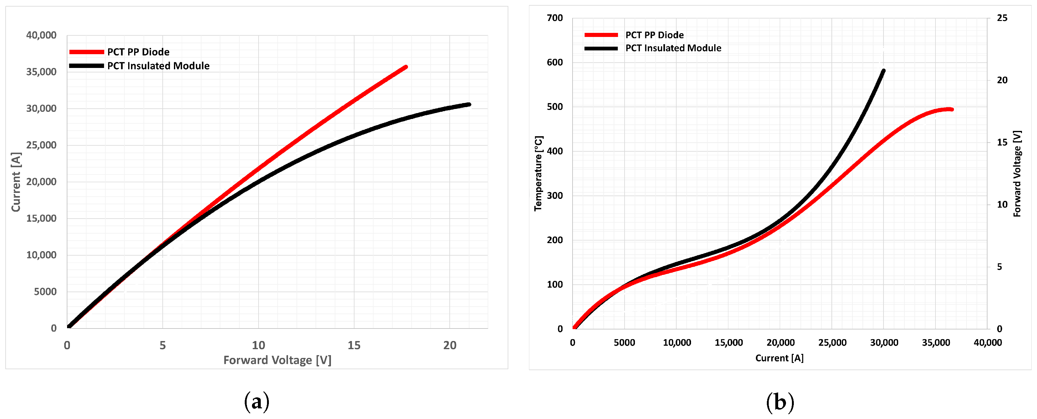 - Ahmad, F.; Vaccaro, L.; Nkembi, A.A.; Marchesoni, M.; Portesine, F. Surge Current Analysis of High-Power Press Pack Diodes: Junction Temperature and Forward-Voltage Modeling. Electronics 2025, 14, 4899. [Google Scholar] [CrossRef]