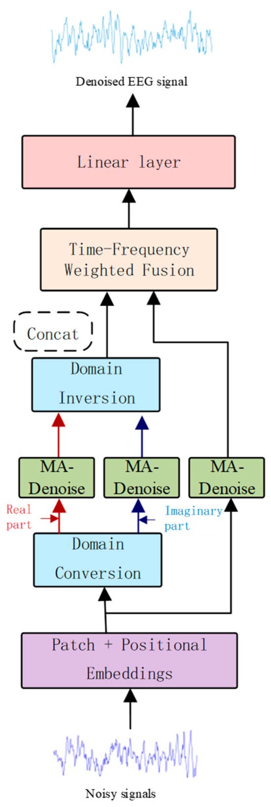 Although deep learning methods have made some progress in artifact removal research, there is still room for further exploration in utilising time-frequency feature information for artifact removal. For example, further processing can be applied to the real and imaginary components within the frequency domain, where different frequency components of the signal reveal distinct characteristics [33]. EEG signals typically exhibit strong fluctuations in the low-frequency range, while EOG and EMG artifacts often manifest as high-frequency noise. Fourier transform can convert data from the time domain to the frequency domain. By transforming the EEG signals into the frequency domain, multi-domain feature extraction can be performed to effectively remove artifact signals.