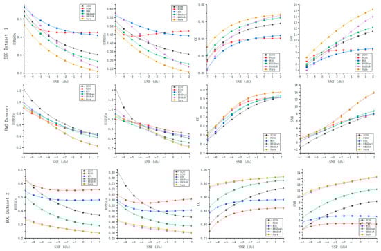 Table 1 presents the average artifact removal performance of different methods under various SNR levels across different datasets. Our method achieves either the lowest or second-lowest values in the RRMSEt and RRMSEs metrics, indicating its superior accuracy in reconstructing the original signal. The proposed model demonstrates more efficient feature extraction and stronger nonlinear fitting capabilities, which contribute to reduced reconstruction errors.